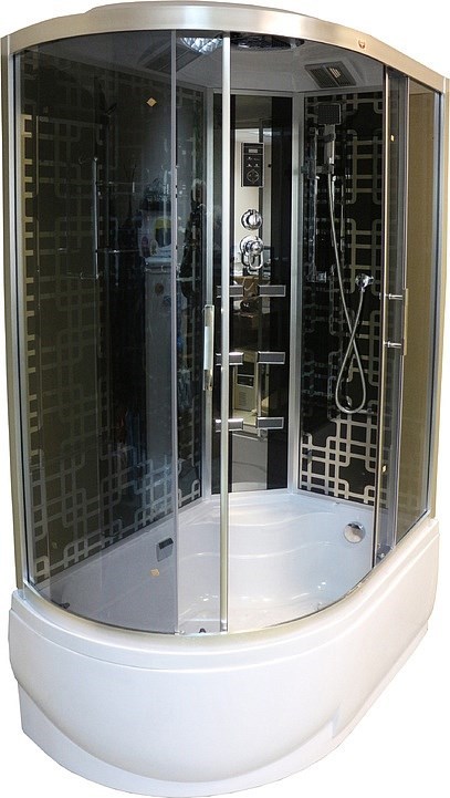 Душевая кабина, высокий поддон, пульт Touch-Screen Blaсk с Радио, Верхний душ, LED подсветка ,вентилятор, динамик, двойная полка, ручная лейка с душевой штангой, гидромассаж спины, задние стекла черные с зеркальным рисунком, полированные профиля, стекла 5мм, двойные ручки, двойные ролики, алюминиевые-полированные магнитные уплотнители,налив воды в поддон, слив-перелив.
