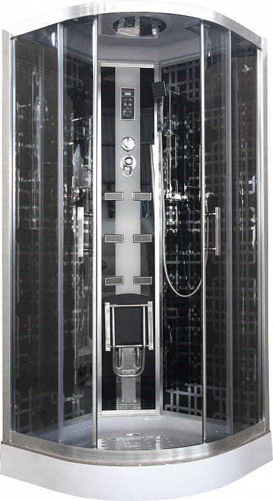Душевая кабина, низкий поддон, пульт Touch-Screen Blaсk с Радио, Верхний душ, LED подсветка ,вентилятор, динамик, двойная полка, ручная лейка с душевой штангой, гидромассаж спины, задние стекла черные с зеркальным рисунком, полированные профиля, стекла 5мм, двойные ручки, двойные ролики, широкие водоотсекатели,алюминиевые-полированные магнитные уплотнители,налив вода в поддон, слив-перелив.