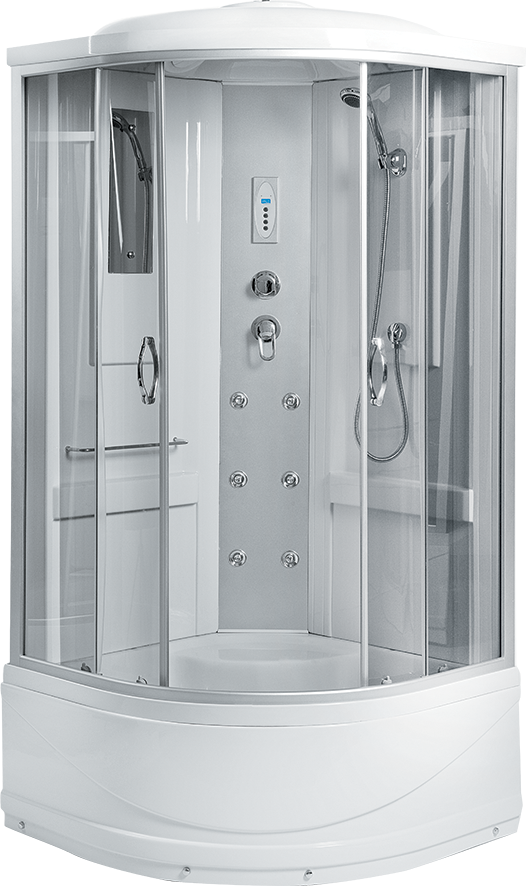 Центральная стойка есть (пластик), тропический душ, ручной душ, гидромассаж спины (форсунок 6 шт), верхний свет, кнопочный пульт, вентилятор, зеркало.