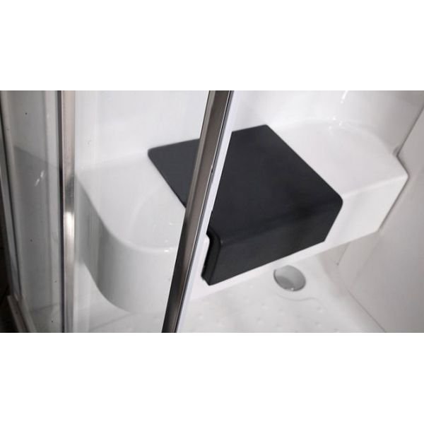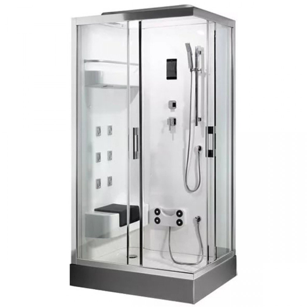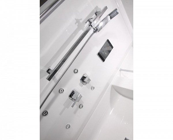 Душевая кабина,передние стекла из закаленного безопасного стекла 5мм с широкими аллюмин.полированными профилями, задняя усиленная акриловая стенка из 2-х частей с 6-ю г/м форсунками, каскадным шейным массажем, смесителем и сенсорным дисплеем, поддон низкий акриловый 170 мм на металлическом каркасе с регулируемыми ножками,со съёмной алюминиевой фронт.панелью,и европейским (широким) сливом, крыша с верх.душем, динамиком, вентилятором,и светильником FM-радио, массажер ног, сидение, полочка, душевая лейка со шлангом на штанге